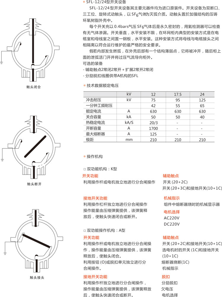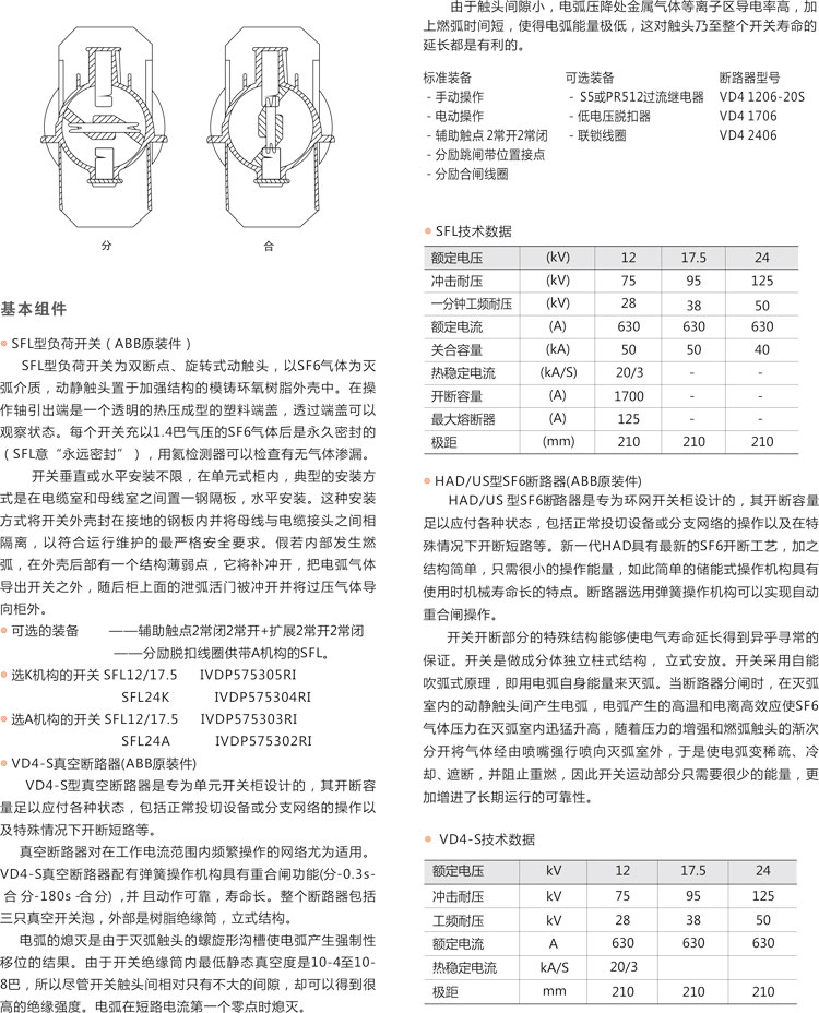 環(huán)網(wǎng)柜的主開(kāi)關(guān)、操作機(jī)構(gòu)及元器件采用ABB公司原裝件或采用進(jìn)口部件國(guó)內(nèi)組裝生產(chǎn)的SFL-12/24型 開(kāi)關(guān)設(shè)備,也可根據(jù)用戶需要配裝ABB公司原裝HAD/US型SF6。斷路器或VD4-S型真空斷路器,其操作方式分為手動(dòng)、電動(dòng)兩種。