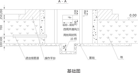 2. 基礎(chǔ)設(shè)在地勢較高處,四周向外排水,采用200#水泥沙漿砌筑,摻3%防水劑,底部向油槽略有傾斜(干變時取消油槽)